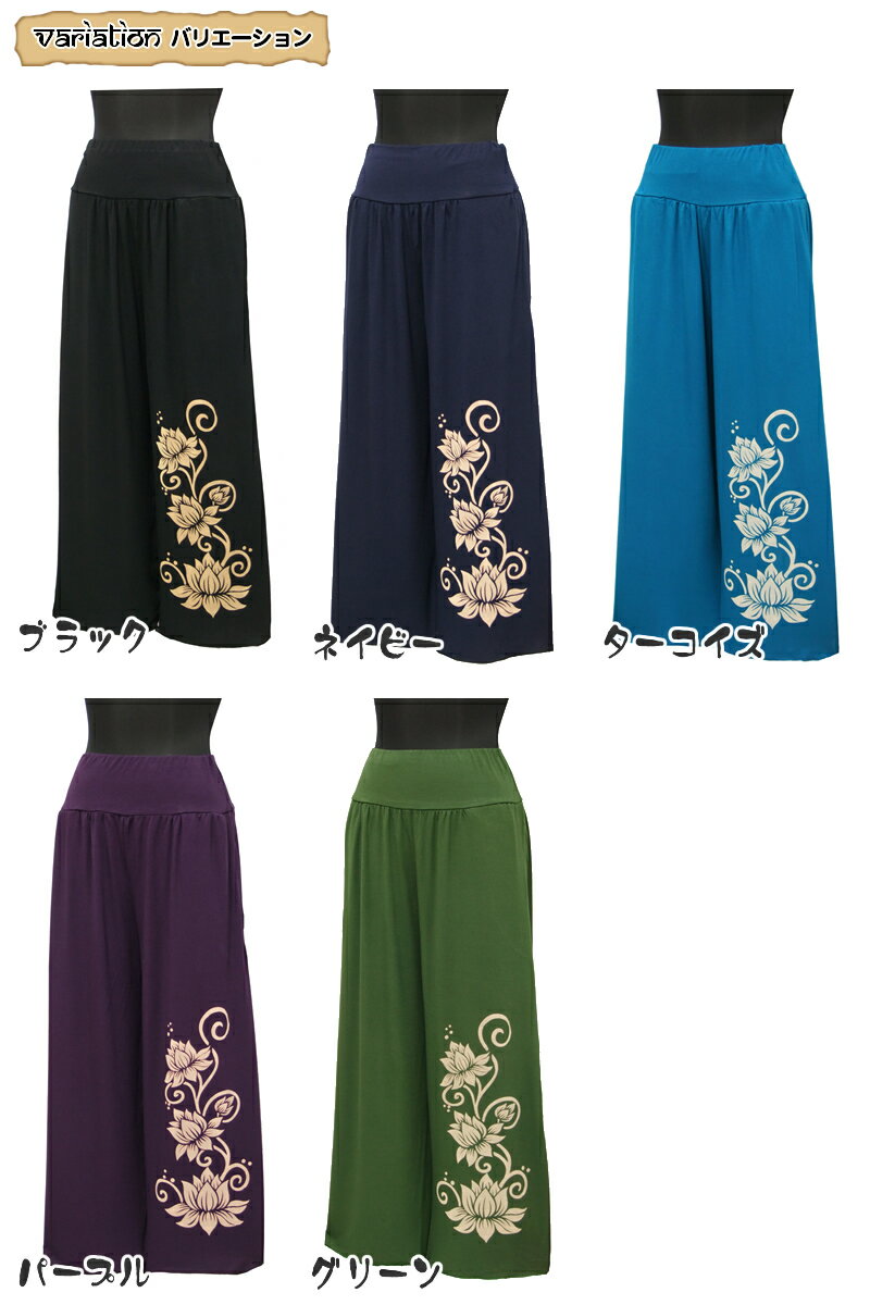 ロータスプリントがエスニックアクセントになったストレッチパンツです。